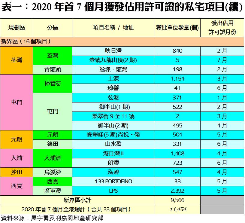 按地區劃分,今年首7個月以新界區的落成私宅單位數量較多,該區共有16個項目落成,涉及單位總數9,566伙,佔同期整體私宅落成量約83.5%;港島區有8個項目落成,涉及單位總數1,005伙,佔同期整體約8.8%;至於九龍區共有9個項目竣工,涉及883伙,佔整體私宅落成量約7.7%。