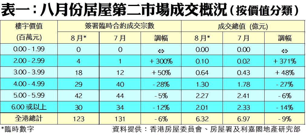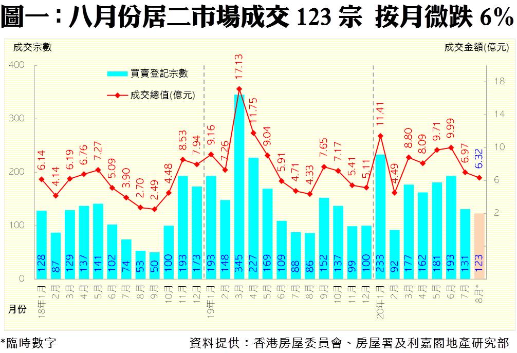 利嘉閣地產研究部主管陳海潮表示,八月份本港新冠疫情仍然嚴峻,二手睇樓及買賣活動受影響,居屋第二市場交投表現續受壓。據香港房屋委員會及房屋署網頁最新數據,今年八月份全港錄123宗居屋第二市場買賣個案(按簽署臨時買賣合約的成交為準),較七月份的131宗按月再跌6%,連跌兩個月;同期物業成交總值約6.32億元,較上月的6.97億元,按月減少9%,量值同創半年新低。