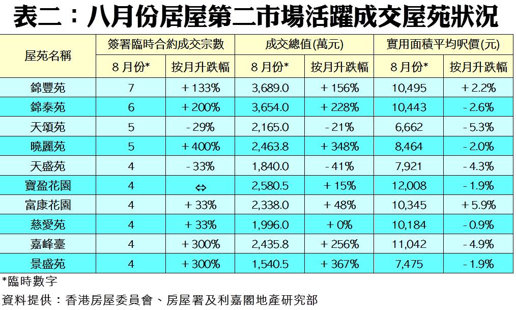 按物業價值劃分(見表一),共有3個組別交投量按月向下,當中價值400萬元至499萬元組別交投按月大減28%,由七月份的40宗,減少至上月只有29宗。按屋苑劃分(見表二),八月份馬鞍山錦豐苑共有7宗買賣,涉及總值約3,689.0萬元,量值分別按月增加133%及156%,成為上月最熱賣屋苑首位。