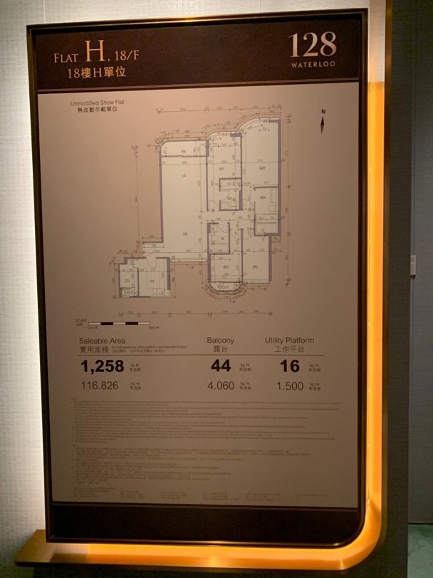 而同層H室亦有一個四房雙套房連裝修示範單位,實用面積1,258方呎,連44方呎露台及16方呎工作平台。