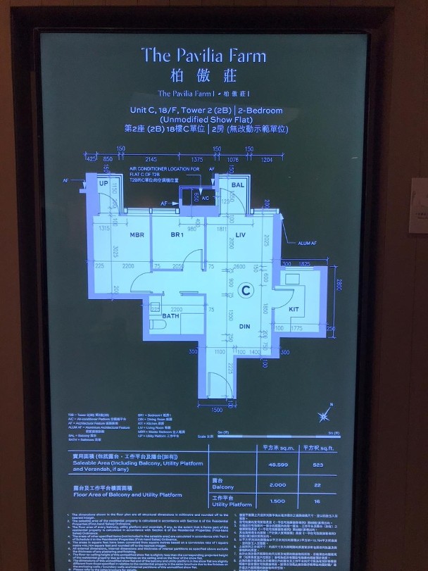 至於根據2B座18樓C室搭建的兩房戶,實用面積523方呎,廚房屬傳統獨立「梗廚」,長方形大廳設有面積22方呎露台,工作平台面積16方呎則位於主人房內。