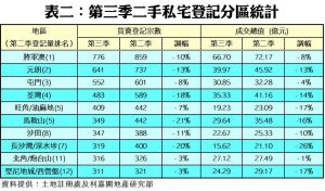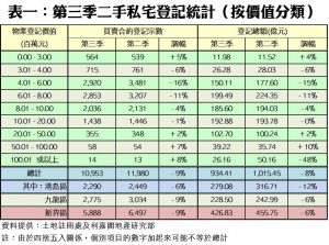 按樓價劃分,今年第三季在9個樓價組別當中,錄得5跌4升,值得注意的是,800萬元以上的中高價組別跌幅相對較細,部分甚至逆市錄得升幅(見表一),如受惠放寬按保樓價上限的801萬至1,000萬元組別仍錄逾二千宗登記,按季只微跌4%,表現優於大市。反之跌幅最大者為樓價介乎400萬至600萬元的組別,由逾三千宗跌至只有2,920宗,按季減少16%,但仍屬買賣登記量最多的組別。