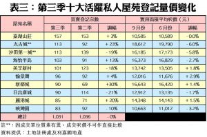 按屋苑劃分,今年第三季十大活躍成交屋苑買賣登記量錄得六升四跌,惟總數仍然守於千宗水平,錄得1,031宗登記,較次季的1,036宗只微跌5宗。季內登記量跌幅最大的屋苑為日出康城,由次季的114宗登記急挫21%,至只有90宗。至於嘉湖山莊則以157宗登記續奪最熱賣屋苑榜首之寶座,而按季比較更逆市升3%;此外,新都城則是榜內升幅最大的屋苑,共錄90宗登記,按季升達30%。