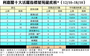 利嘉閣地產董事陳大偉表示,大圍站新盤銷情理想,市場資金流向一手市場。雖然新項目帶旺了市場氣氛,惟二手平盤匱乏,買家入市步伐略放慢。綜合利嘉閣地產分行數據所得,全港十大活躍指標屋苑在上周(12/10–18/10)錄58宗買賣個案,較前周(5/10–11/10)的56宗按周增加4%,平均每個屋苑錄約6宗買賣個案,交投表現平穩。