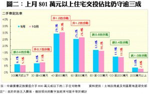 陳海潮指出,隨著疫情在八月下旬逐漸好轉,加上九月持續放寬限聚措施,刺激不少中細價樓買家重投市場,帶動九月份800萬元以下物業交投佔比出現回升。在7個銀碼組別中(見圖二),中細價物業的兩大主流銀碼佔比升幅顯著,其中銀碼介乎601至800萬元物業的升幅最大,佔比由25.2%增加1.2個百分點,至26.4%;其次銀碼介乎401萬至600萬元者亦升1個百分點至30.3%。反之,中高價物業交投佔比全線回落,其中銀碼介乎801萬至1,000萬元的組別按月跌0.8個百分點,至16.2%,而2,000萬元以上者更跌1個百分點至只有2.6%,反映中高價物業買賣情況稍見回氣。