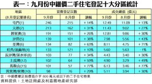 以十大活躍成交地區作分析,上月全港十個中細價二手住宅買賣登記量最活躍地區的登記宗數全線上升。當中以馬鞍山區升勢最凌厲,上月錄101宗,按月漲77%;荃灣區及土瓜灣區亦分別升63%及59%。至於登記量最多的仍然是屯門區,上月錄得246宗,續居榜首,按月亦增加14%(詳見表一)。