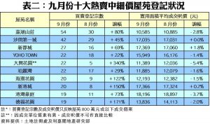 以屋苑層面分析,上月十大熱賣中細價屋苑登記量同樣錄得全線上升,當中登記量最多的熱門上車屋苑嘉湖山莊交投量按月上升80%,錄得54宗登記,蟬聯桂冠。不過,要數升幅最大的屋苑,則為大興花園,交投量有22宗,按月勁升3.4倍;其次,德福花園及新港城則分別升1.7倍及1.5倍,至各自的19宗及20宗(詳見表二)。