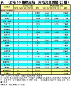 至於,港島區8個指標屋苑上周共錄21宗成交,按周減少22%,其中藍灣半島交投量由前周的4宗,大減75%至上周的1宗;鯉景灣成交量按周減少50%,上周亦只錄1宗買賣;康怡花園及杏花村交投量分別按周減少33%及25%,各自錄得4宗及3宗買賣。此外,在全港50個指標屋苑當中,上周共有11個屋苑錄得「零成交」,較前周的14個減少21%,當中港島區及九龍區各佔1個及3個,新界區則佔7個(詳見表一)。