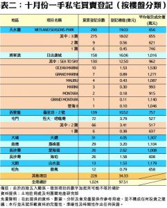按樓盤分類,WETLAND SEASONS PARK第3期上月錄275宗登記,成為十月份登記量最多的一手私宅項目,登記總值達18.02億元,平均每宗登記約655萬元;次名為西營盤藝里坊‧2號的139宗登記,第三是SEA TO SKY的130宗。至於登記排行榜內上月平均每宗買賣成交價最高者為日出康城OCEAN MARINI的1,530萬元,而較低平均價者是恆大‧珺瓏灣2期的517萬元。