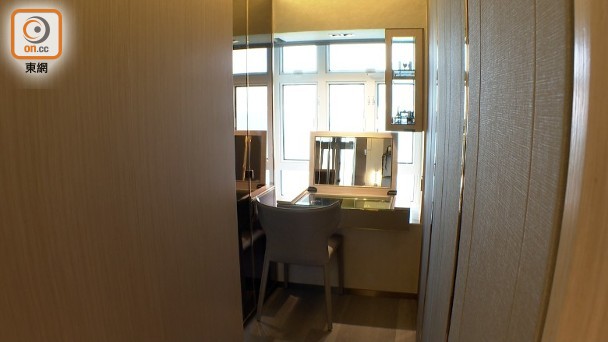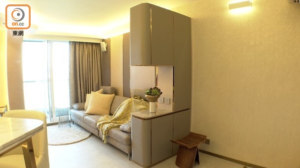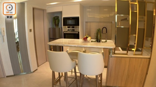 至於實用性方面,單位欠缺工人房,加上戶主兩夫婦少下廚,所以設計師將廚房「搬出」客廳,變成開放式,原則的廚房則變成工人房,令空間更實用。