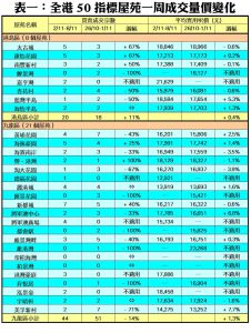 至於,港島區8個指標屋苑上周累錄20宗成交,按周增加2宗或11%,其中藍籌屋苑太古城及康怡花園,交投量分別由前周的3宗,各自增加67%至上周的5宗;南豐新村成交量則按周增加50%,上周共錄得3宗買賣;不過,鯉景灣期內則未聞買賣,交投量暫時「捧蛋」。此外,在全港50個指標屋苑當中,上周共有13個屋苑錄得「零成交」,較前周的8個增加63%,當中港島區佔1個,九龍區及新界區則各佔6個(詳見表一)。