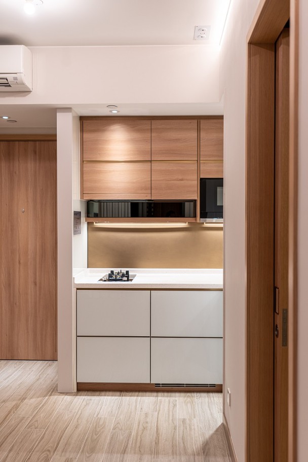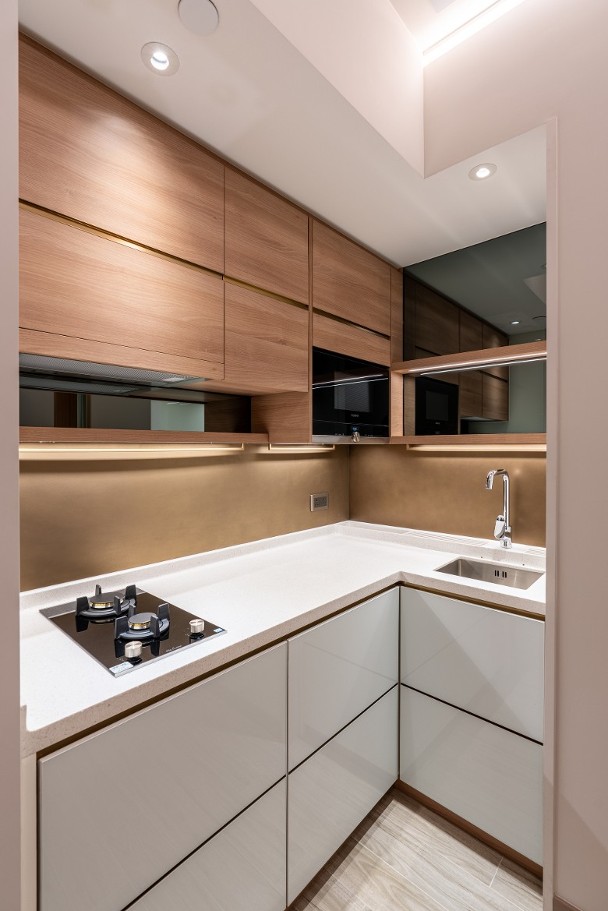 廚房採用開放式設計,配備意大利品牌嵌入式煤氣煮食爐,亦配有德國品牌抽油煙機、雪櫃、洗衣乾衣機及微波爐。
