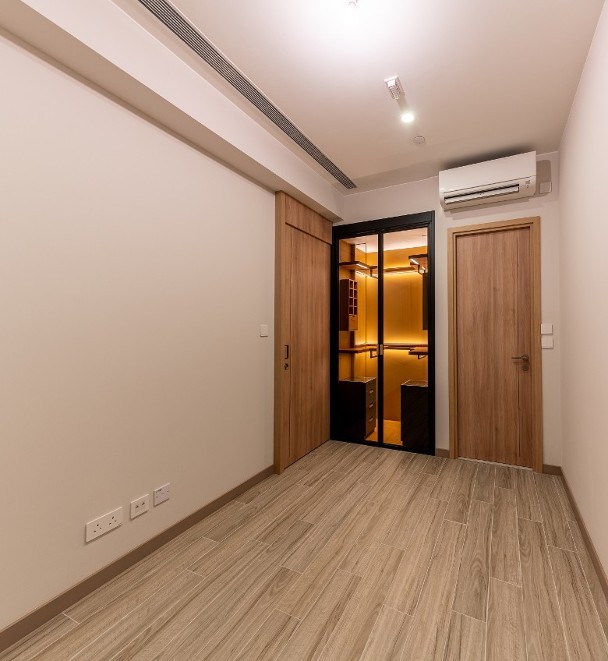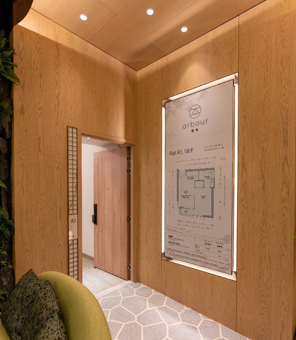 是次設有1個交樓標準示範單位,參照18樓A1室搭建,實用面積350方呎,間隔一房設計。其中客飯廳外接面積22方呎露台,提高室內採光度,睡房屬套房設計,間隔方正實用。所有單位皆設專屬衣櫃,層板採用優質皮革材質。