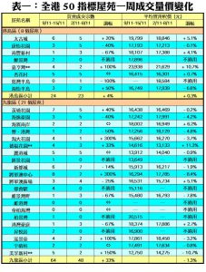 至於,港島區8個指標屋苑上周累錄24宗成交,按周增加1宗或4%,其中嘉亨灣錄得4宗交投,較前周的2宗增加1倍;海怡半島成交量則按周增加50%,上周共錄得3宗買賣;藍籌屋苑太古城交投量由前周的5宗,增加20%至上周的6宗。此外,在全港50個指標屋苑當中,上周共有5個屋苑錄得「零成交」,較前周的13個減少62%,當中港島區佔1個,九龍區及新界區則各佔2個(詳見表一)。