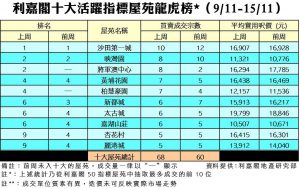 在上周十大活躍成交屋苑當中,共有5個屋苑交投量向上,升幅介乎20%至3倍不等。當中將軍澳中心交投升幅最顯著,由前周2宗增至上周8宗,按周增加3倍。至於沙田第一城期內錄得10宗買賣,連續3周登上最熱賣屋苑寶座。