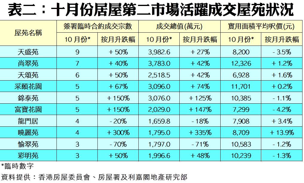 按物業價值劃分(見表一),共有4個組別交投量按月向下,當中價值600萬元或以上的貴價組別交投按月跌幅較顯著,由九月份的55宗,減少至上月只有25宗,按月大減55%。按屋苑劃分(見表二),十月份沙田愉翠苑只有3宗買賣,涉及總值約1,797.0萬元,量值分別按月大減70%及71%,成為按月跌幅最大的十大成交屋苑。