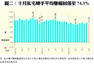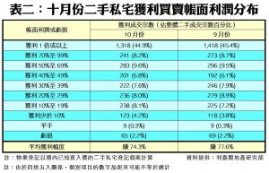 數據顯示,今年十月份每宗私宅轉手個案平均賺幅為74.3%,維持月升月跌的震盪格局,較九月份微跌3.3個百分點(見圖二)。十月份,帳面獲利1倍或以上的轉手個案佔整體二手私宅買賣比例為44.9%,按月跌0.5個百分點,共錄1,318宗;至於帳面錄得虧損者有65宗,佔比按月持平在2.2%,而平手的個案有9宗,佔比亦持平在0.3%。