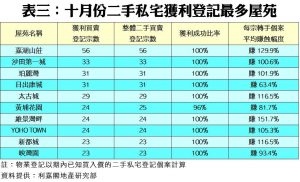 此外,檢視上月10個獲利登記最多的屋苑,當中有9個達到百分百獲利,而每宗平均賺幅則介乎最少的63.4%至最多的151.7%不等。當中以維景灣畔錄得的每宗轉手個案平均賺幅最高,達1.52倍。至於上月榜內賺幅最低者為日出康城,平均每宗只賺約63.4%,其次為黃埔花園的81.7%(見表三)。