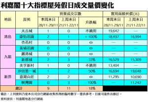 於剛過去的周末十大指標屋苑買賣當中,按地區劃分,香港區、九龍區及新界區同樣各錄得3宗成交,但只有香港區較上周末錄增加2宗;新界區則較上周末少4宗,是下跌宗數最多的地區。若以屋苑劃分,康怡花園、新都城及嘉湖山莊表現最佳,各錄得2宗成交;而錄得1宗成交分別有太古城、美孚新村及沙田第一城;其餘杏花村、黃埔花園、麗港城及映灣園等屋苑本周末同樣錄得零成交。