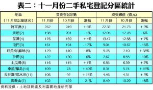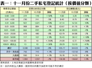 今年十一月份,按二手私宅價值分類,9個價格組別的買賣登記量錄得五升四跌,跌者當中,以401萬至600萬元的組別跌幅較大,由十月的1,021宗減少10%,至上月的922宗,並為最旺的登記組別;其次,301萬至400萬元的組別亦跌5%至230宗。至於錄得升幅最顯著者為銀碼介乎5,001萬至1億元的組別,月內錄得33宗,按月大漲2.3倍。