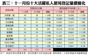 此外,上月十大活躍二手私人屋苑登記量錄七升三跌,並以嘉湖山莊的跌幅最大,月內有46宗登記,較十月的62宗大減26%,並失榜首之位;取而代之的是沙田第一城,月內錄48宗登記,按月升26%,成功登上皇者寶座。至於日出康城及映灣園上月登記分別大升45%及42%,各自錄得45宗及34宗登記,成最大升幅首兩位。