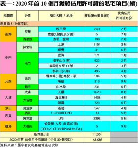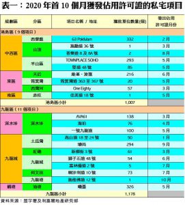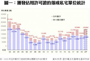 陳海潮指出,今年首10個月落成量佔差估署2020年全年預測的20,850伙僅66%,進度表現落後於預期,雖然餘下兩個月仍有數個大型項目可望趕及竣工,包括將軍澳日出康城5期MALIBU(1,600伙)、觀塘「凱匯」(1期)(1,025伙)、天水圍「Wetland Seasons Park」(1期)(710伙)、白石角「雲匯」(2期)(640伙)、北角「君譽峰」(281伙)等,但因第4波新冠疫情急惡化影響,地盤施工進度可能受阻,相信2020年全年落成量或將低於政府原先預測目標。