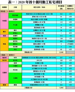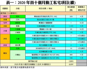 利嘉閣地產研究部主管陳海潮表示,在未有大型項目動工之下,十月份私宅動工數字持續偏低。根據屋宇署今日發表最新數據,2020年十月份全港共有3個私人住宅項目動工(按屋宇署接獲上蓋建築工程動工通知為準),涉及單位343伙,較九月份的130伙增加逾1.6倍,為近三個月最多;不過,今年首十個月累計私宅動工量合共6,691伙,較去年同期的8,953伙減少25%,續創六年同期新低。