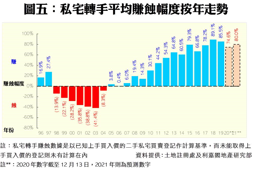 值得留意的是,過去兩年,樓市先後受中美貿易戰、社會運動及新冠病毒拖累,二手私宅轉手每宗平均賺幅由2018年的歷史高位89.1%,連跌兩年,跌至今年只有七成的水平。2020年截至12月13日,二手私宅轉手賺幅達74.6%(見附錄圖五),較2019年全年的85.5%回落10.9個百分點,至於全年計,賺幅料變化不大,而展望2021年冀有力重上八成的水平。