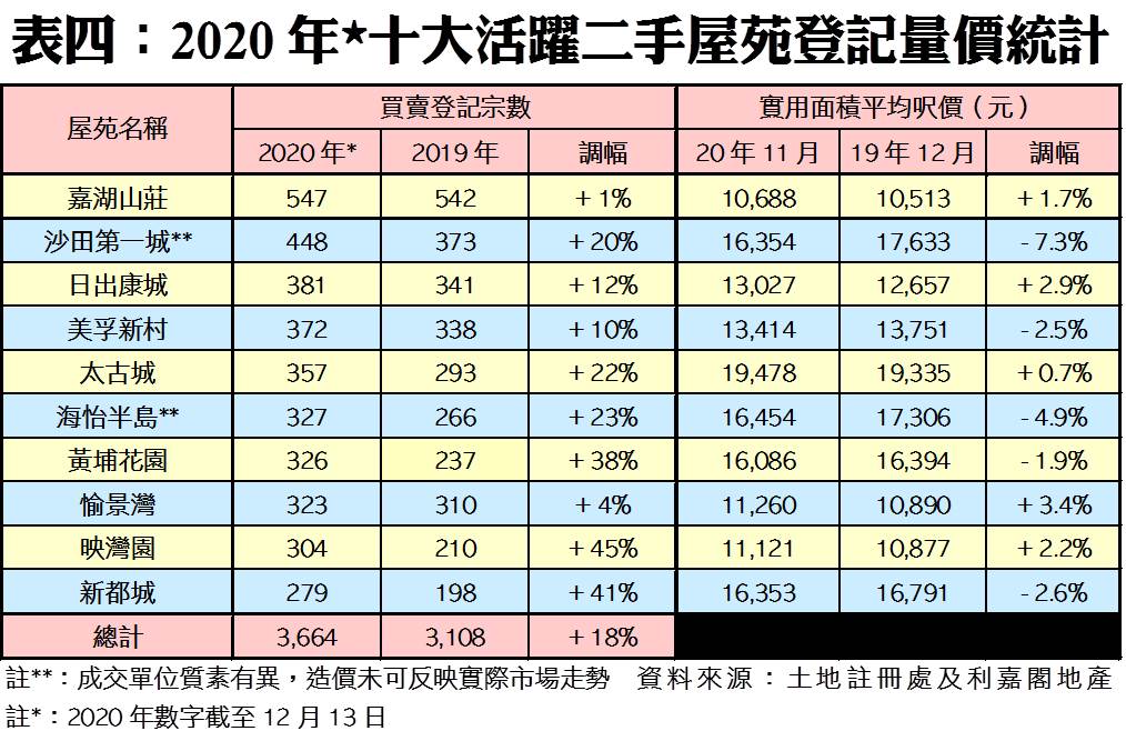 另外,按十大活躍二手屋苑表現分析,截至2020年12月13日為止,嘉湖山莊再度蟬聯買賣登記量最活躍的屋苑,暫時累錄547宗,較去年全年所錄得的542宗已多出1%;緊隨其後者為沙田第一城的448宗及日出康城的381宗,兩者分別暫較去年全年多出20%及12%。至於另一熱門老牌屋苑─美孚新村今年暫時守在第四位,錄372宗登記,按年暫時增10%。港島及九龍區的藍籌屋苑如太古城及黃埔花園,則各錄得357宗及326宗登記,分別按年暫時大升22%及38%(見附錄表四)。