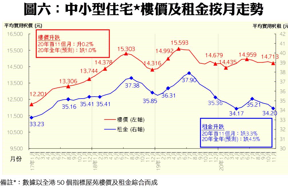 檢視2020年樓價,陳大偉指中小型住宅(以全港50個指標屋苑作依據)價格於今年首11個月累升0.2%,預計全年最終將錄約1.0%的跌幅;豪宅物業方面(以差估署大型單位作依據),預測全年跌幅約3.5%。至於租金走勢方面,中小型住宅2020年全年租金最終料跌4.5%,而豪宅租金全年料跌5.0%(見表一)。