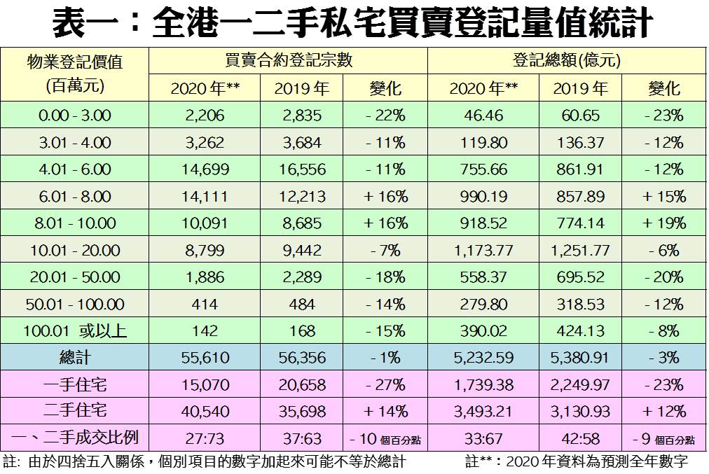 總結整體私宅表現,根據土地註冊處資料,截至今年12月13日為止,2020年整體私人住宅累錄52,930宗買賣登記,涉及金額約為4,970.66億元。按走勢推算,預計今年全年登記量最終可達約5.56萬宗,較2019年微跌1%,維持在約5.5萬宗的水平窄幅徘徊,並為近六年來的第3高水平;物業成交總值方面,預測全年將微跌約3%,至約5,232.59億元,連跌2年,兼為近4年最少(見附錄圖一及附錄表一)。
