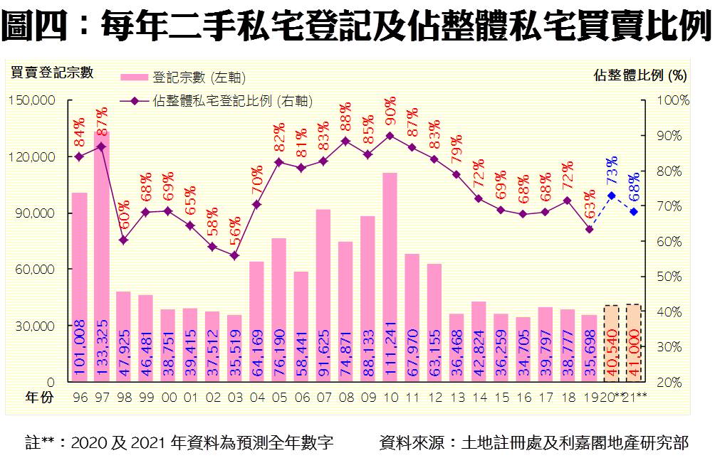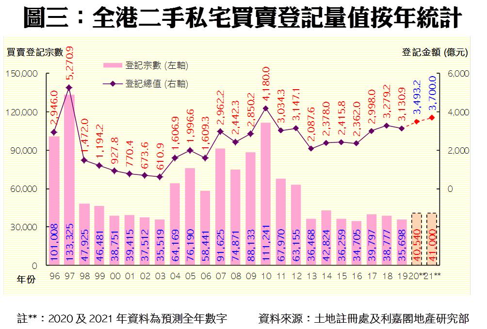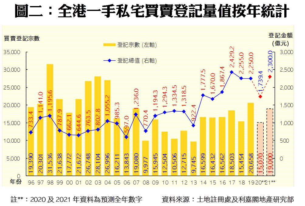 預期2021年發展商將積極推盤,追回進度,全年一手私宅登記量料可重上較高水平,關鍵是有多少大型新盤可以應市。至於二手市場方面,因應新一份施政報告並無調整住宅辣招,故料可保持平穩。預期明年整體一二手私宅合計登記量料將由今年約5.56萬宗,增加8%至約6萬宗的水平,有機會創9年來新高,並於期內首達六萬宗水平;當中一手私宅買賣料達1.90萬宗,較2020年的約1.51萬宗大增約26%;而二手私宅成交量則會較今年的4.05萬宗,微升約1%至4.10萬宗,有機會創近七年高位。