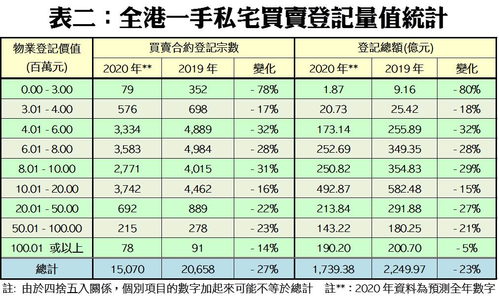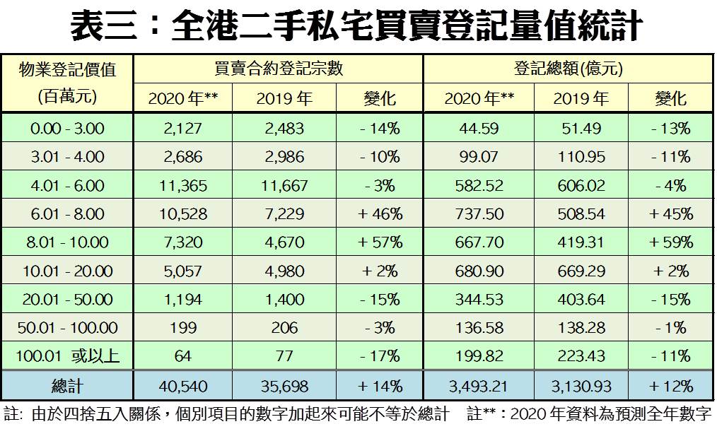 截至今年12月13日為止,二手私宅買賣登記量值分別錄39,003宗及3,356.66億元,預期全年登記量最終錄約4.05萬宗,較2019年的3.57萬宗升14%,將創近6年以來的新高,並為期內首度突破四萬宗大關;而全年成交總值料達3,493億元,將按年升約12%,並且創下近10年來的新高紀錄(見附錄圖三及附錄表三)。按每宗二手私宅平均成交價計算,2020年料為862萬元,將按年微跌近2%。
