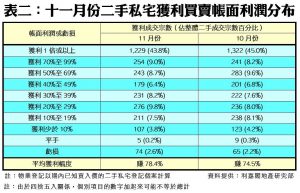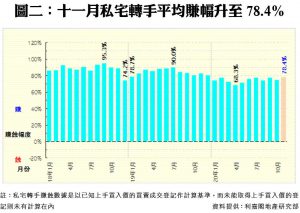 數據顯示,今年十一月份每宗私宅轉手個案平均賺幅為78.4%,反覆波動格局未改,較十月份回升3.9個百分點(見圖二)。十一月份,帳面獲利1倍或以上的轉手個案佔整體二手私宅買賣比例為43.8%,按月跌1.2個百分點,共錄1,229宗;至於帳面錄得虧損者有74宗,佔比按月增至2.6%,而平手的個案有5宗,佔比亦略降至0.2%。