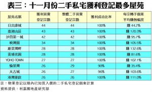 此外,檢視上月10個獲利登記最多的屋苑,當中有8個達到百分百獲利,而每宗平均賺幅則介乎最少的35.4%至最多的132.6%不等。當中繼續以維景灣畔錄得的每宗轉手個案平均賺幅最高,達1.33倍。至於上月榜內賺幅最低者為愉景灣,平均每宗只賺約35.4%,其次為日出康城的44.2%(見表三)。