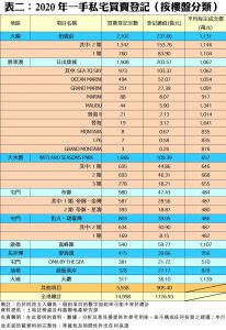 按樓盤分類,2020年熱賣樓盤之首為柏傲莊,1期及2期合共錄得2,102宗登記;其次WETLAND SEASONS PARK共3期項目則有1,666宗;第三為帝御的金灣及星濤兩期共錄980宗登記;再者為SEA TO SKY的973宗。至於登記排行榜內去年平均每宗成交價最高者是晉海的約1,641萬元,而較低平均價者為帝御‧星濤的約480萬元(見表二)。