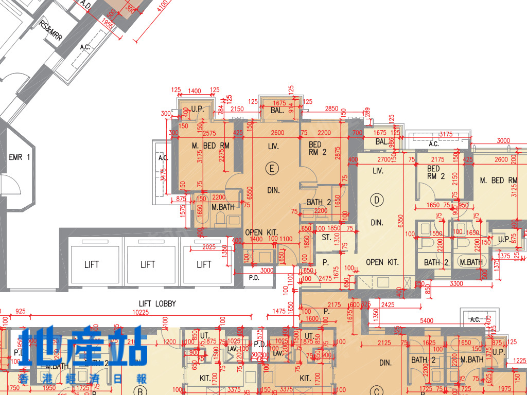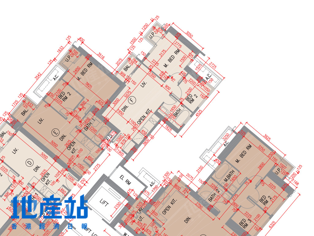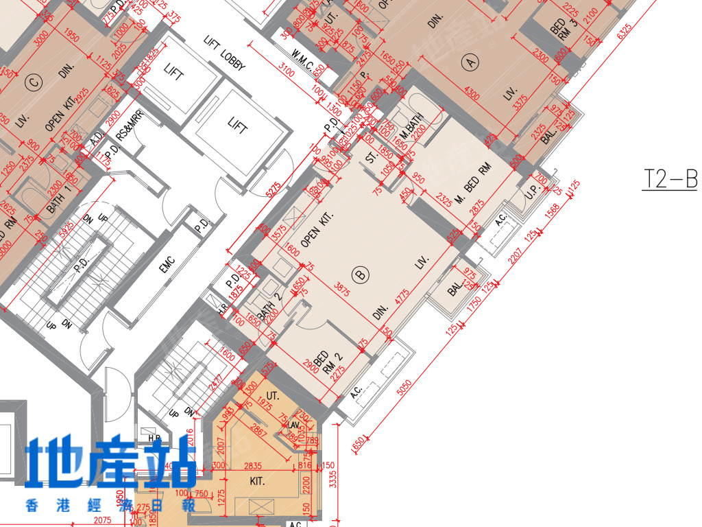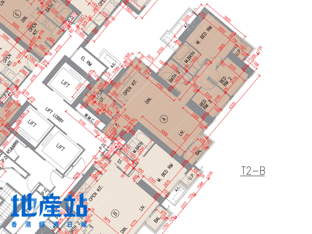 2B座C至F室方面,C室及F室面積及開則相近,小玄關直駁長廳,露台位則在廳區側邊位,而長廳末端則連接一細一大睡房;D及E室面積及開則相近,484至488平方呎,屬市面常見開則,短走廊連接一細一大睡房,開放式廚房L形工作枱。