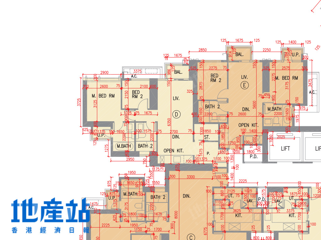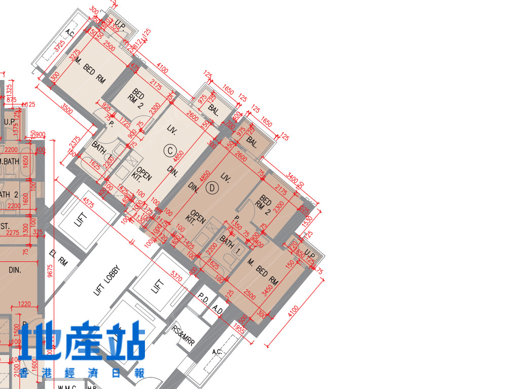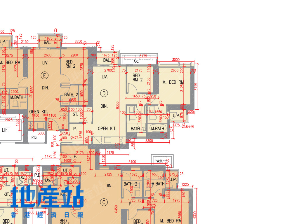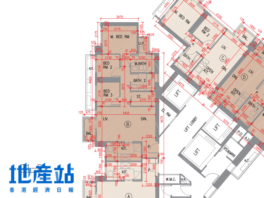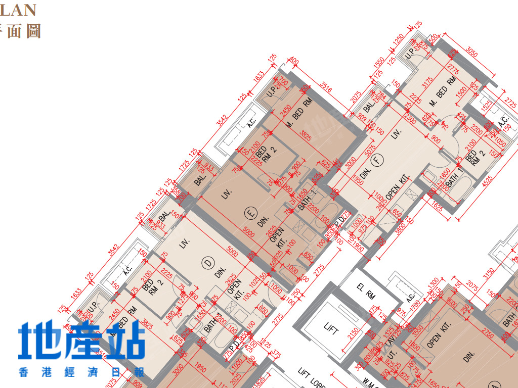 2B座C至F室方面,C室及F室面積及開則相近,小玄關直駁長廳,露台位則在廳區側邊位,而長廳末端則連接一細一大睡房;D及E室面積及開則相近,484至488平方呎,屬市面常見開則,短走廊連接一細一大睡房,開放式廚房L形工作枱。