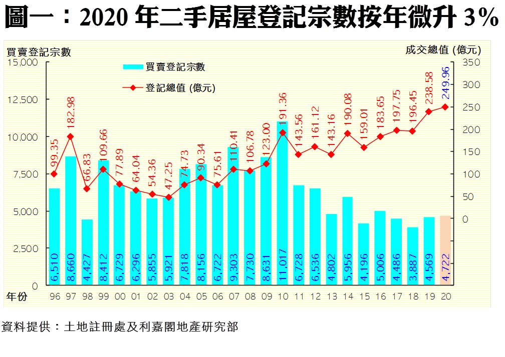 利嘉閣地產研究部主管陳海潮表示,去年受新冠肺炎疫情影響,二手買賣活動雖一度受阻,惟隨著市場適應限聚措施,加上減價放盤不時出現,吸引用家出手接貨,二手居屋交投整年保持平穩。根據土地註冊處最新資料,2020年全年二手居屋錄4,722宗買賣登記,較2019年的4,569宗微升3%,創近4年最多;至於去年居屋成交總值按年增加5%至約249.96億元,更連續兩年再次創下自1996年有紀錄以來最多。