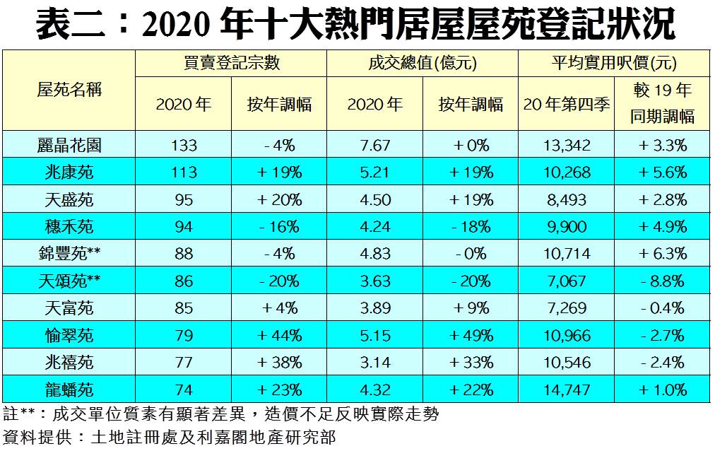如按屋苑細分(見表二),2020年以九龍灣麗晶花園的成交登記量最多,共錄得133宗買賣,但較2019年的139宗減少4%;至於屋苑期內成交總值7.67億元,按年增加不足1%,而平均實用呎價則按年上升3.3%。