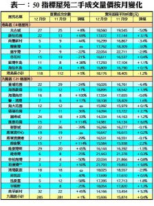 列入觀察名單的50個指標屋苑當中,上月樓價報跌的屋苑有26個,佔整體比率52%,報升者則有24個。當中,上月樓價錄得實質跌幅較顯著的屋苑包括深井碧堤半島、青衣灝景灣、鰂魚涌太古城及紅磡黃埔花園,分別錄6.5%、6.2%、5.0%及4.4%的實質跌幅。至於錄得樓價升幅較顯著的指標屋苑包括藍田匯景花園、荔枝角美孚新村、馬鞍山銀湖‧天峰及鰂魚涌康怡花園,實質按月升幅分別為6.0%、5.3%、5.2%及3.1%。