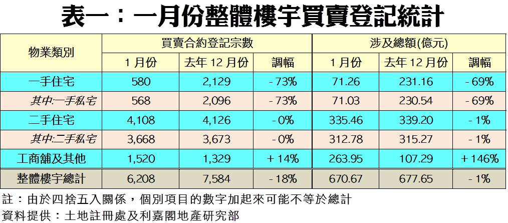 至於非住宅市場方面,受惠撤銷雙倍印花稅所刺激,商廈及純車位買賣登記量都有不俗表現,帶動今年一月份整體工商舖及其他物業成交量逆市上升14%,期內共錄得1,520宗登記,而期內登記金額因一宗涉及167.28億元的大額商廈登記而推高,導致按月金額激增1.46倍,至263.95億元。