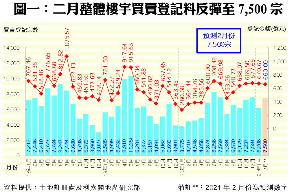 利嘉閣地產研究部主管陳海潮指出,因新冠疫情持續纏繞所拖累,發展商放慢推盤腳步,導致上月樓宇買賣登記表現走弱,終止兩連升。根據土地註冊處數據所得,2021年一月全港共錄6,208宗樓宇買賣登記(數字主要反映去年十二月中旬至今年一月上旬的樓市實際狀況),較去年十二月的7,584宗減少18%,創近3個月新低;而月內整體物業登記總值僅微跌1%,錄得670.67億元,則屬近7個月次高。