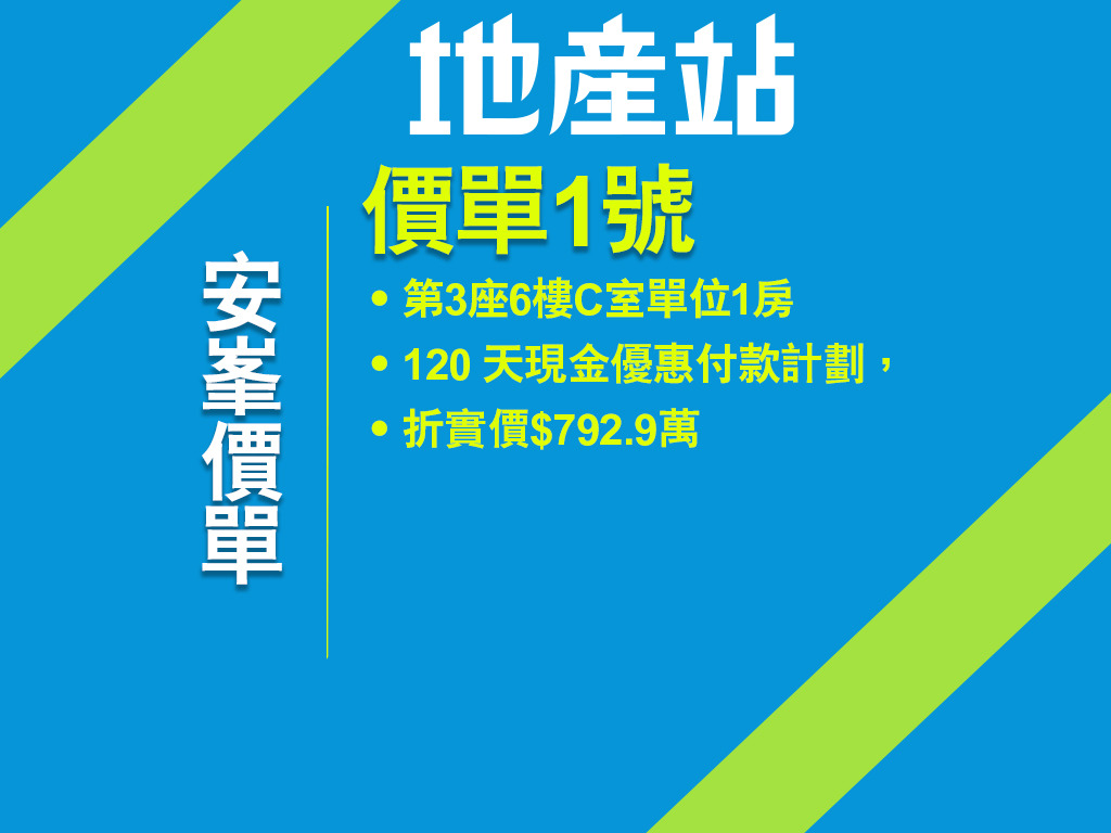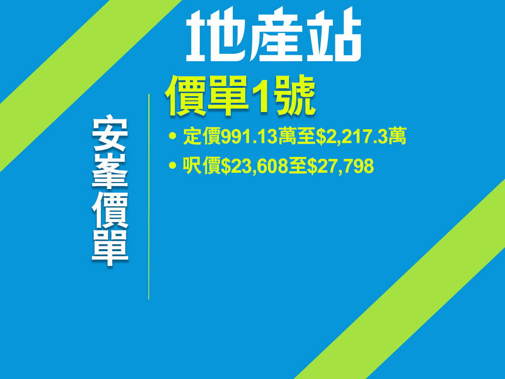 安峯首張價單共68伙單位,面積377至831平方呎,包括1房至3房單位,價單定價991.13萬至2,217.3萬元,價單呎價23,608至27,798元,120天即供提供最高20%折扣,整批折實樓價792.9萬至1,773.84萬,折實呎價18,886元至22,239元。當中最平單位見於3座6樓C室,1房最高折實792.9萬元入場。