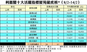 在上周十大活躍成交屋苑當中,共有6個屋苑交投量回落,跌幅介乎17%至50%不等。當中維景灣畔交投跌幅最顯著,由前周8宗減至上周只有4宗,按周大減50%。至於嘉湖山莊期內錄得9宗買賣,成為上周最熱賣屋苑。