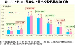細看一月份數據,在7個銀碼組別中(見圖二),中細價物業的兩大主流銀碼佔比一升一跌,其中銀碼介乎401萬至600萬元物業的升幅最大,佔比由28.1%增加1.6個百分點,至29.7%;不過銀碼介乎601至800萬元者則微跌0.1個百分點至25.6%。反之,中高價物業交投佔比則跌多升少,其中銀碼介乎801萬至1,000萬元的組別錄得最大跌幅,按月減少1.3個百分點,至16.0%;而1,001萬至2,000萬元及2,000萬元以上者則各自上升0.3及下跌0.3個百分點,反映中高價物業買賣佔比回軟。