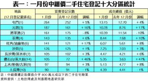 展望後市,陳海潮指出,一月中打後,大單位的新盤銷情理想,帶動二手中高價物業同見轉旺,加上整體樓市氣氛回暖,中高價住宅交投再現,或令二月份登記的中細價樓買賣佔比再次逆轉回落,下試67%至68%之間的水平。