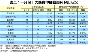 以屋苑層面分析,上月十大熱賣中細價屋苑登記量同樣升多跌少,當中登記量升幅最顯著者為新港城,交投量按月大增1.6倍,錄得21宗登記;而藍天海岸及YOHO TOWN亦分別升64%及50%,雙雙錄得18宗登記,升幅屬第二及第三高。至於,榜首常客嘉湖山莊也錄得29%的升幅,以54宗之數繼續成為最熱賣中細價屋苑(詳見表二)。