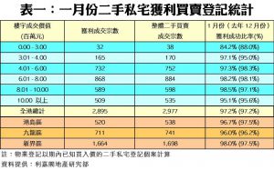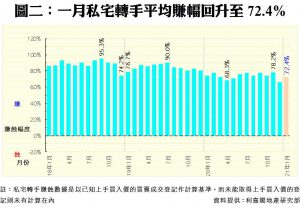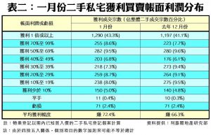 數據顯示,今年一月份每宗私宅轉手個案平均賺幅為72.4%,續處反覆波動的走勢,較去年十二月份回升6.1個百分點(見圖二)。一月份,帳面獲利1倍或以上的轉手個案佔整體二手私宅買賣比例為43.3%,按月升2.2個百分點,共錄1,290宗;至於帳面錄得虧損者有71宗,佔比按月持平在2.4%,而平手的個案有11宗,佔比微增0.1%。