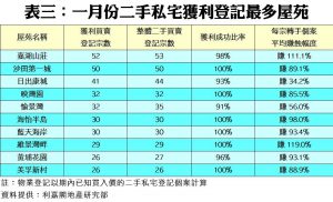 此外,檢視上月10個獲利登記最多的屋苑,當中有6個達到百分百獲利,而每宗平均賺幅則介乎最少的34.2%至最多的119.0%不等。當中維景灣畔再度成為錄得每宗轉手個案平均賺幅最高的屋苑,達1.19倍。至於上月榜內賺幅最低者為日出康城,平均每宗只賺約34.2%,其次為愉景灣的56.0%(見表三)。